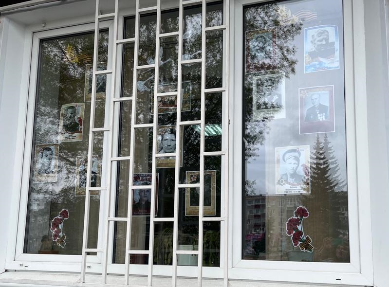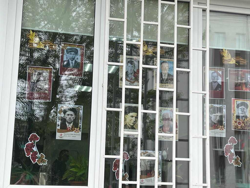 Каждому посетителю Центра сегодня был вручен символ Дня Победы, а окна учреждения украшены фотографиями участников ВОВ.