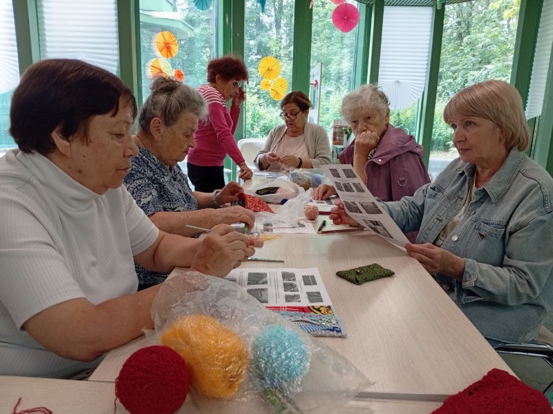 Вчера в центре Долголетия парка Швейцария прошло замечательное творческое занятие для пенсионеров. Участники совместно вязали полезные и красивые вещицы — ключницу, очешник и пенал.